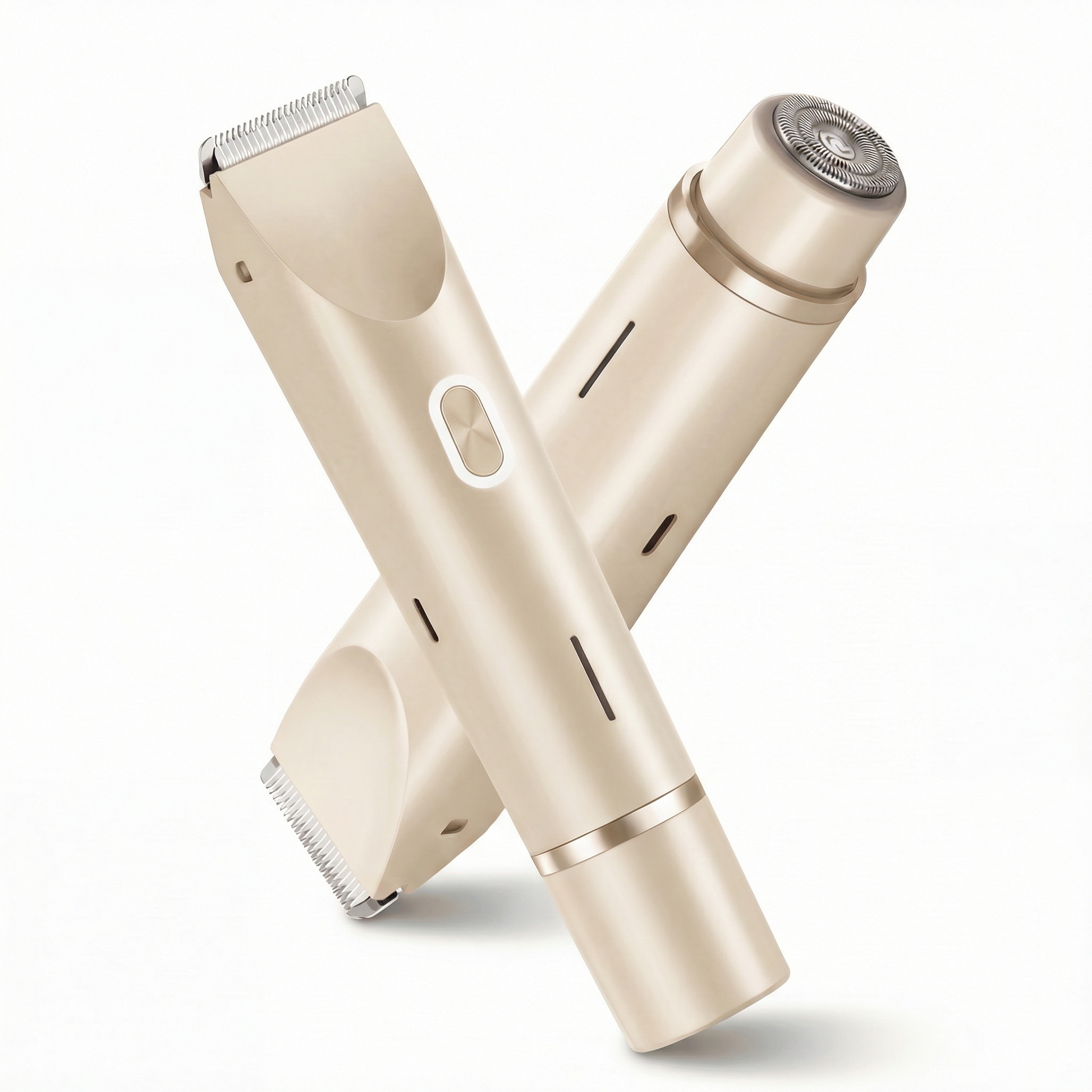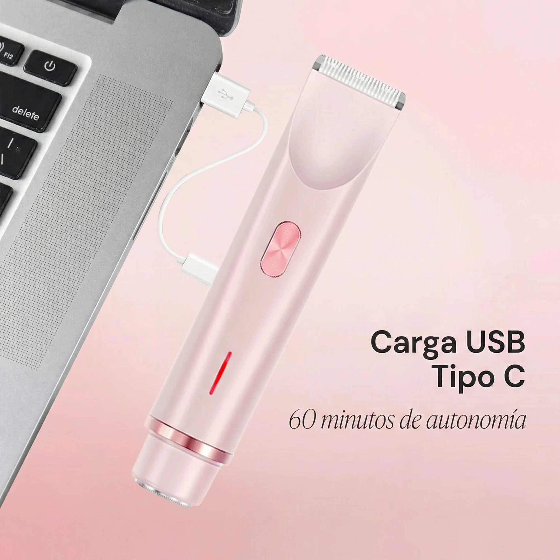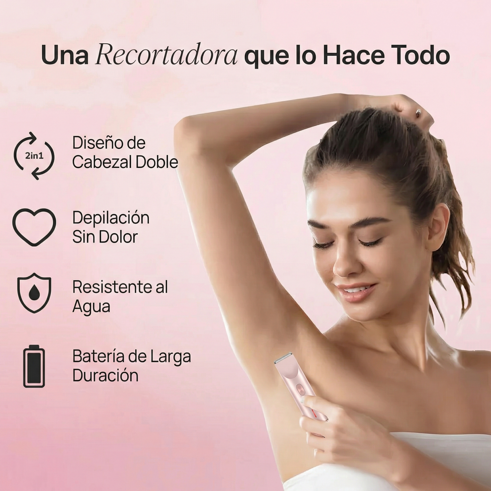 Un solo dispositivo que combina un cabezal para el cuerpo (bikini, axilas, piernas) y un cabezal de precisión para el rostro. No es necesario cambiar cuchillas.